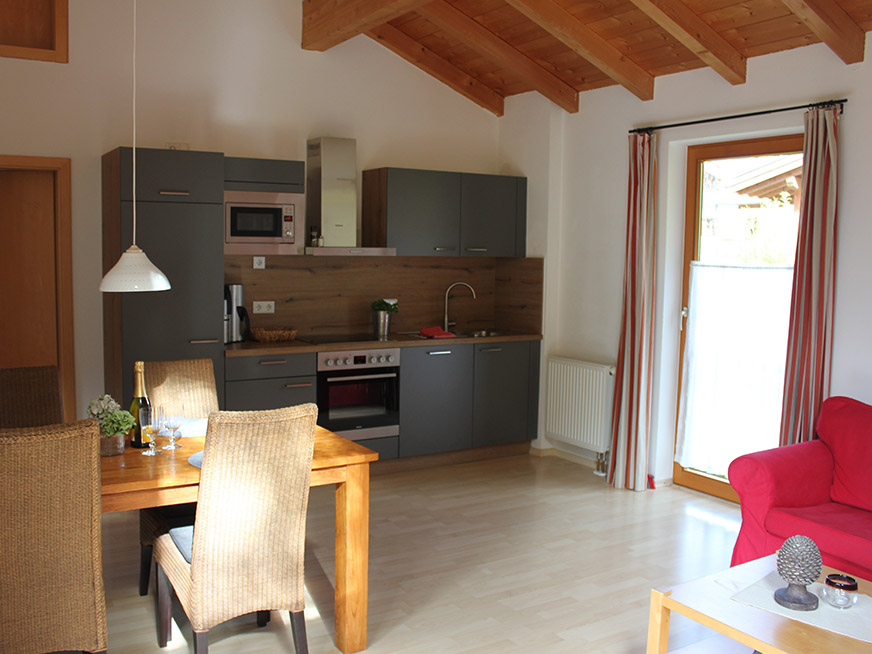 Wohnen Sie in herrlicher, absolut ruhiger Lage mit unverbautem Blick auf Kofel und Oberammergau in unseren komfortablen 4-Sterne-Ferienwohnungen.